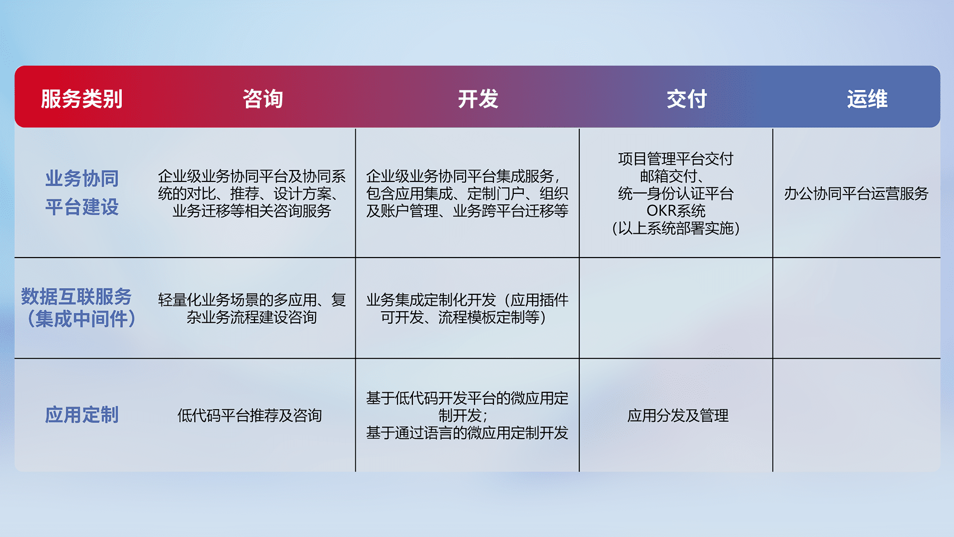 针对钉钉、、、、企微、、、IDaas等平台级产品提供产品的规划、、、方案、、、、交付、、、定制化开发等服务,,实现如统一协同办公、、智能客户服务、、、混合会议管理、、、、智能数据查询、、、等业务场景,,,实现数字化转型。。。